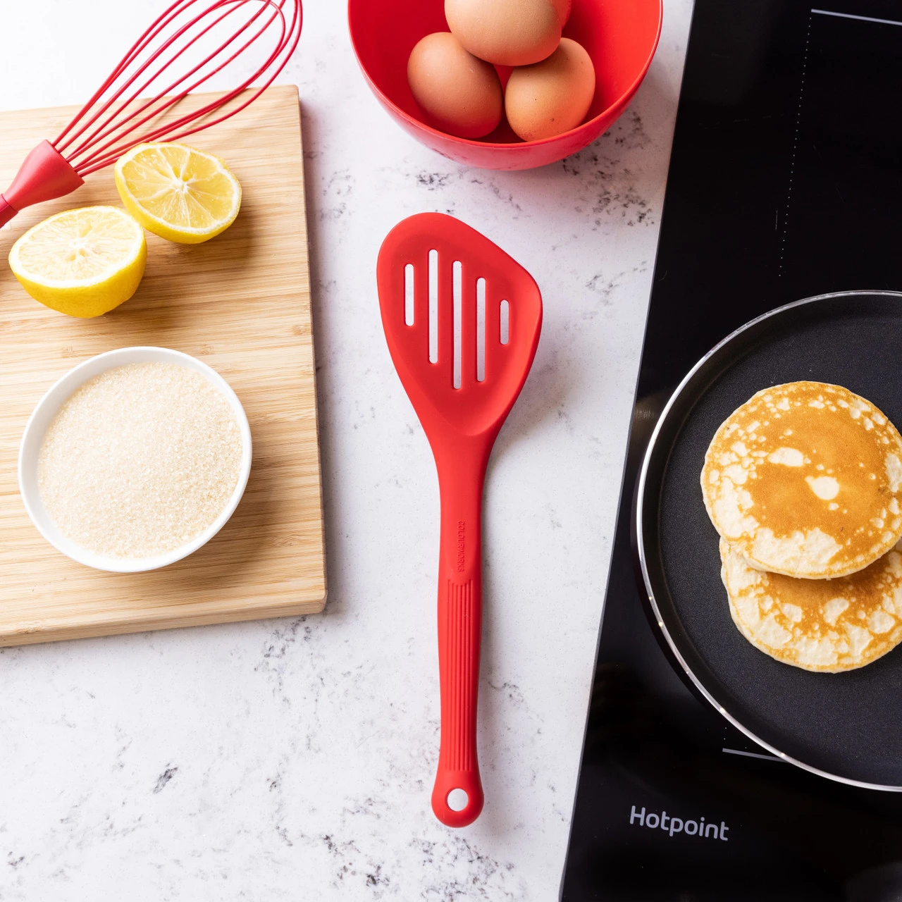 Roer de groente in de pan of draai een pannenkoek om. Het is allemaal mogelijk met de Colourworks spatel in de kleur rood. De spatel is zeer stevig door de versteviging van nylon is het handvat en staal in de kop van de spatel. De buitenkant is gemaakt van siliconen waardoor de pan niet wordt beschadigd en geen krassen achterlaat. Aan de kop van de spatel zit ook een rand, waardoor het eten gemakkelijk kan worden opgeschept. De spatel is 28 centimeter lang en hittebestendig tot 260 graden. Het kan in de vaatwasser worden schoongemaakt.