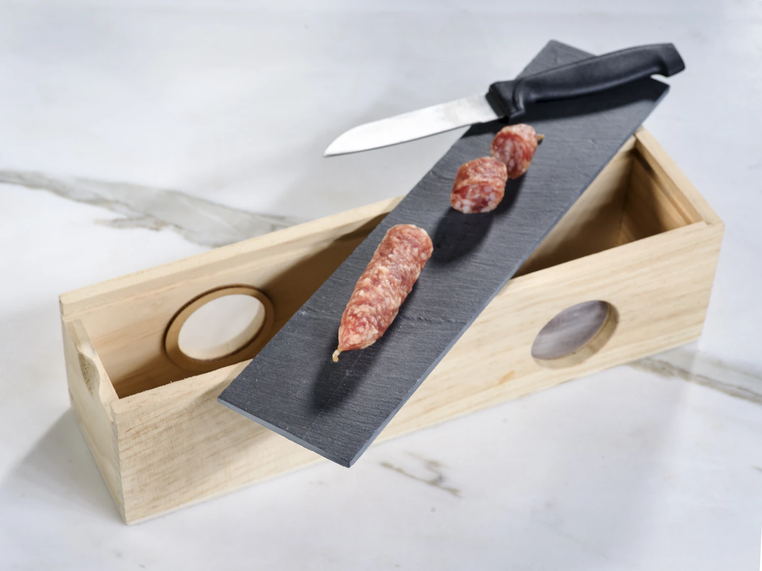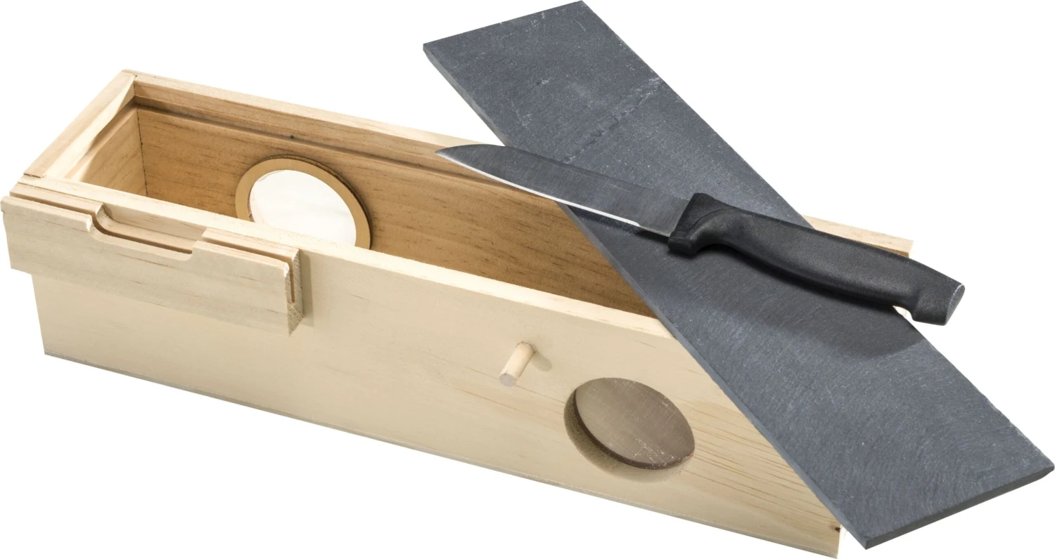 Droog uw worst op kamertemperatuur met deze Cosy & Trendy worstenbox. De set is 3-delig met een opbergdoos, snijplank en mes. Voor het beste resultaat kunt u de worst het beste drogen op kamertemperatuur. De ventilatiegaten zijn voorzien van een handig gaasje, zodat er geen beestjes bij kunnen komen. Met de leistenen deksel kunt u de worst snijden en stijlvol serveren.