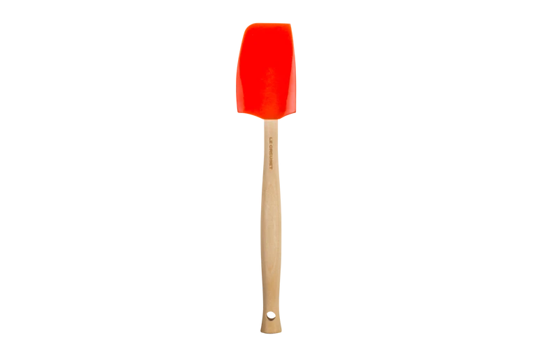 Deze middelgrote Le Creuset Premium in het oranjerood is geschikt voor allerlei doeleinden en heeft het ideale formaat voor dagelijks gebruik. Dit hulpmiddel staat voor je klaar bij het voorbereiden, roeren of sauteren van ingrediënten. De spatel is gemaakt van hoogwaardig hout en afgewerkt met een siliconen blad. Het siliconen blad laat geen krassen achter en is geschikt voor pannen met een antiaanbaklaag. De spatel is hittebestendig tot 250 °C. Klaar met koken? Verwijder het siliconen blad, zodat je hem eenvoudig kan reinigen.