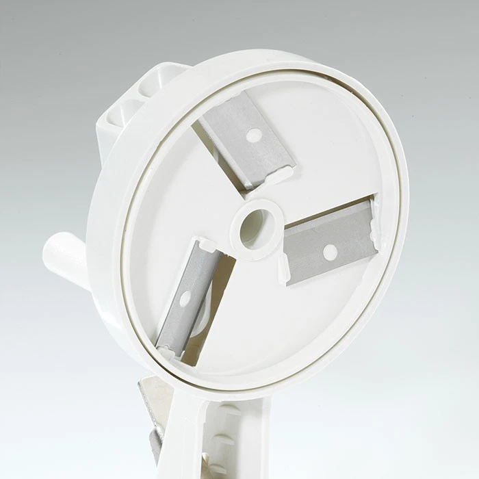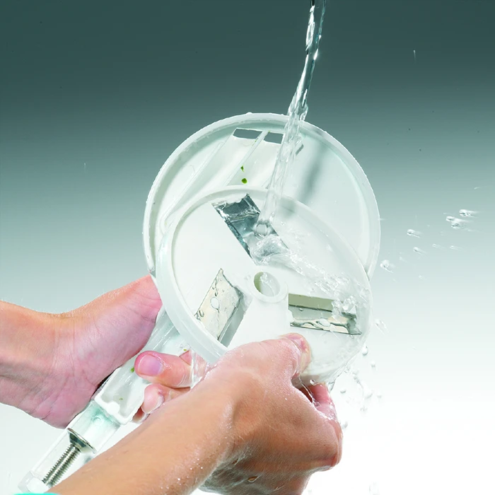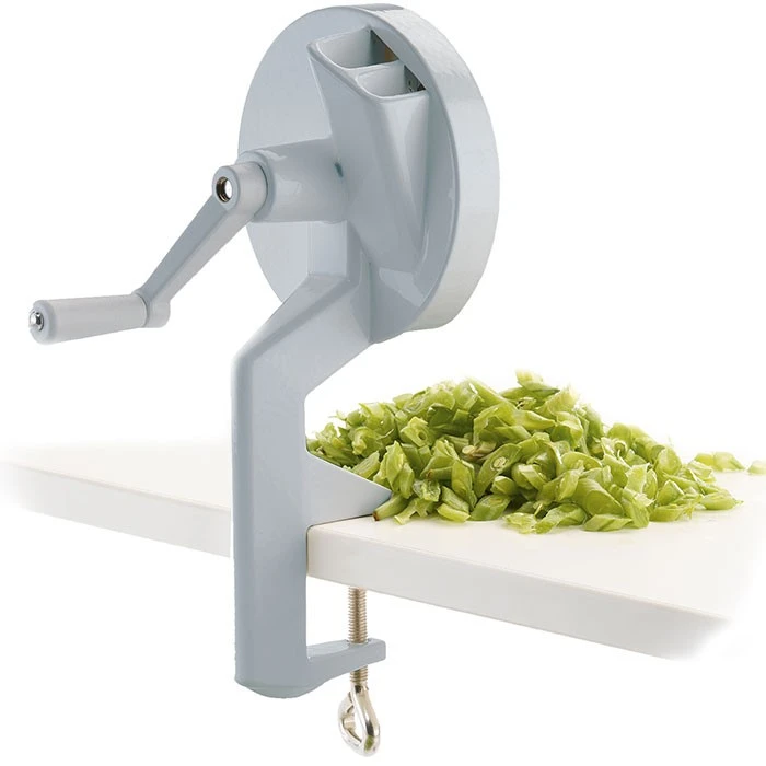 De snijbonenmolen is gemaakt van aluminium en een speciale coating voor voedsel. De schroefklem zorgt ervoor dat hij stevig op het werkblad staat zonder dat er schade aan de bovenkant ontstaat. Hij is makkelijk schoon te maken en heeft drie scherpe messen.