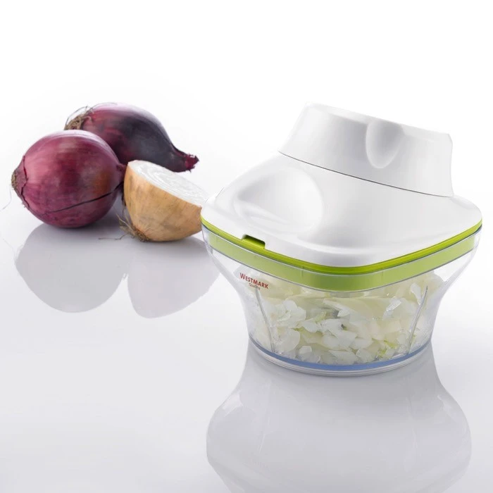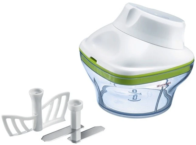De Westmark groentehakker is perfect voor het hakken van uien, fruit of verse kruiden. Je krijgt er ook een extra garde bij voor het mengen van dressings bijvoorbeeld. Het opvangbakje heeft een inhoud van 25 cl. De groentehakker is gemaakt van kunststof en siliconen, dus na gebruik raden we aan om hem schoon te maken met wat warm water en mild afwasmiddel.