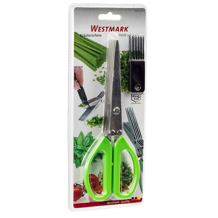 De Westmark kruidenschaar is perfect voor het snel knippen van allerlei kruiden. Met de vijf roestvrijstalen bladen is het knippen van kruiden een fluitje van een cent. Daarnaast krijg je er een handig kammetje bij waarmee je de schaar makkelijk schoon kunt maken. Koken met verse kruiden wordt zo een eitje!